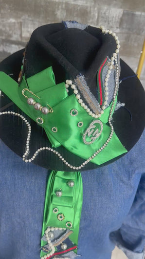 The Crown Fedora is hand-embellished with pearl detailing, jeweled accents, and rich emerald satin that wraps the brim like royalty. Every stitch and stone is intentional — bold, artistic, and unmistakably one-of-one.