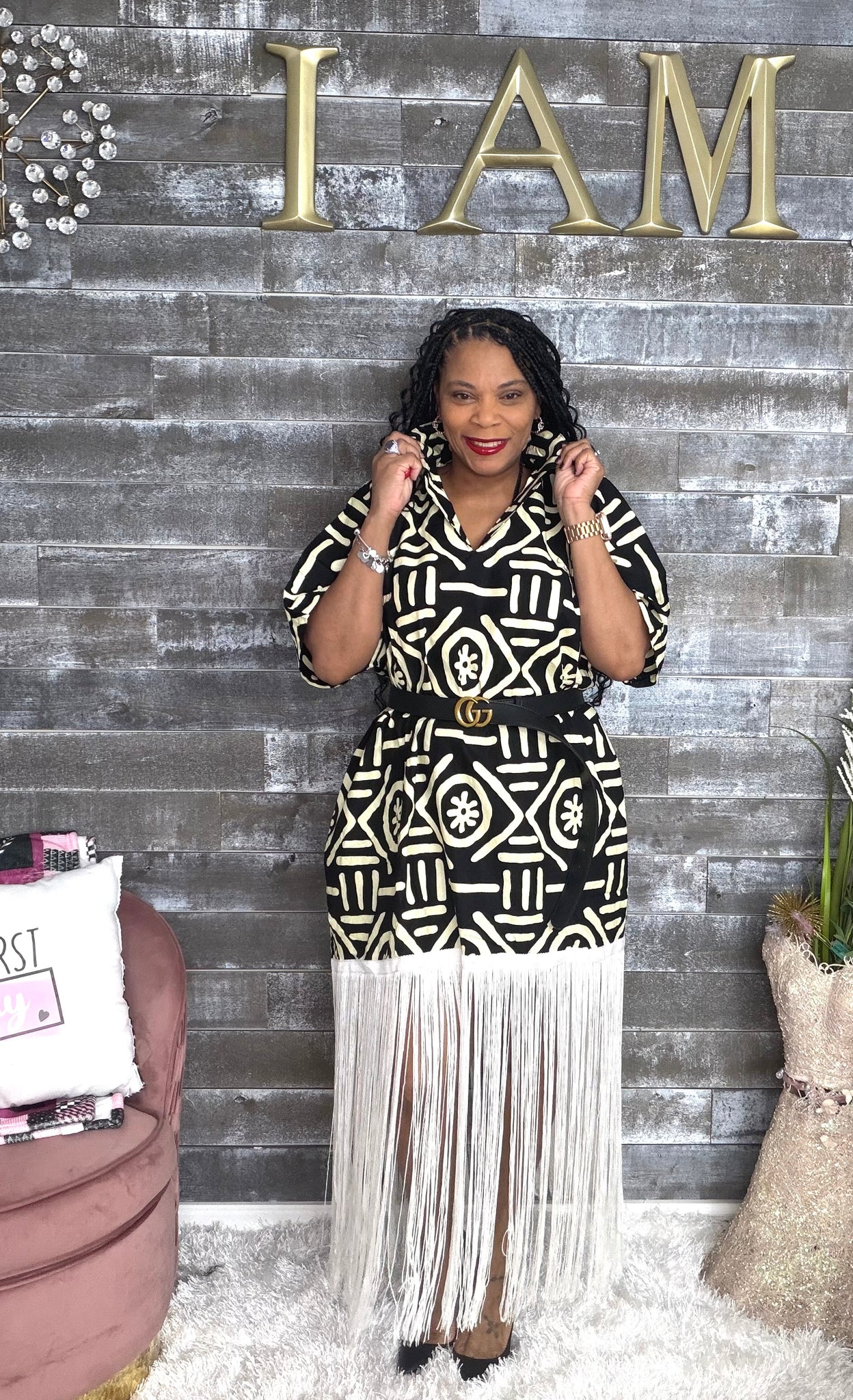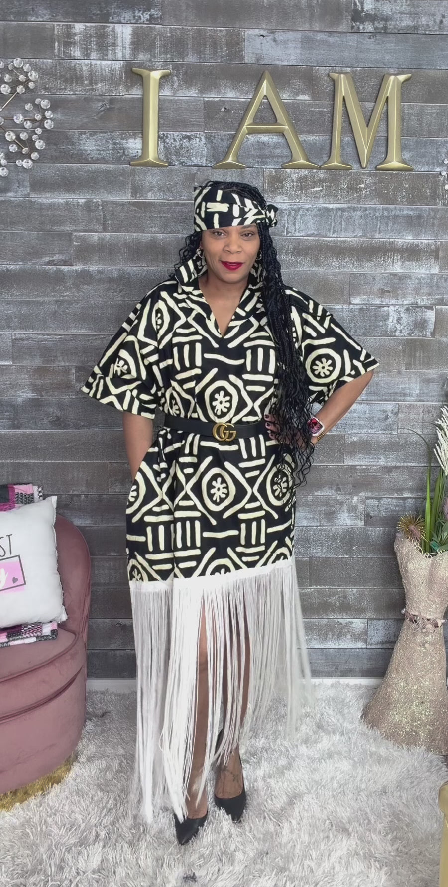 The I AM Tribal Grace Fringe Set is a statement of confidence and identity. Designed in a striking black and ivory tribal-inspired print, this flowy silhouette commands attention while honoring strength and heritage. The matching headwrap completes the look, creating a seamless expression of royalty and self-assurance.