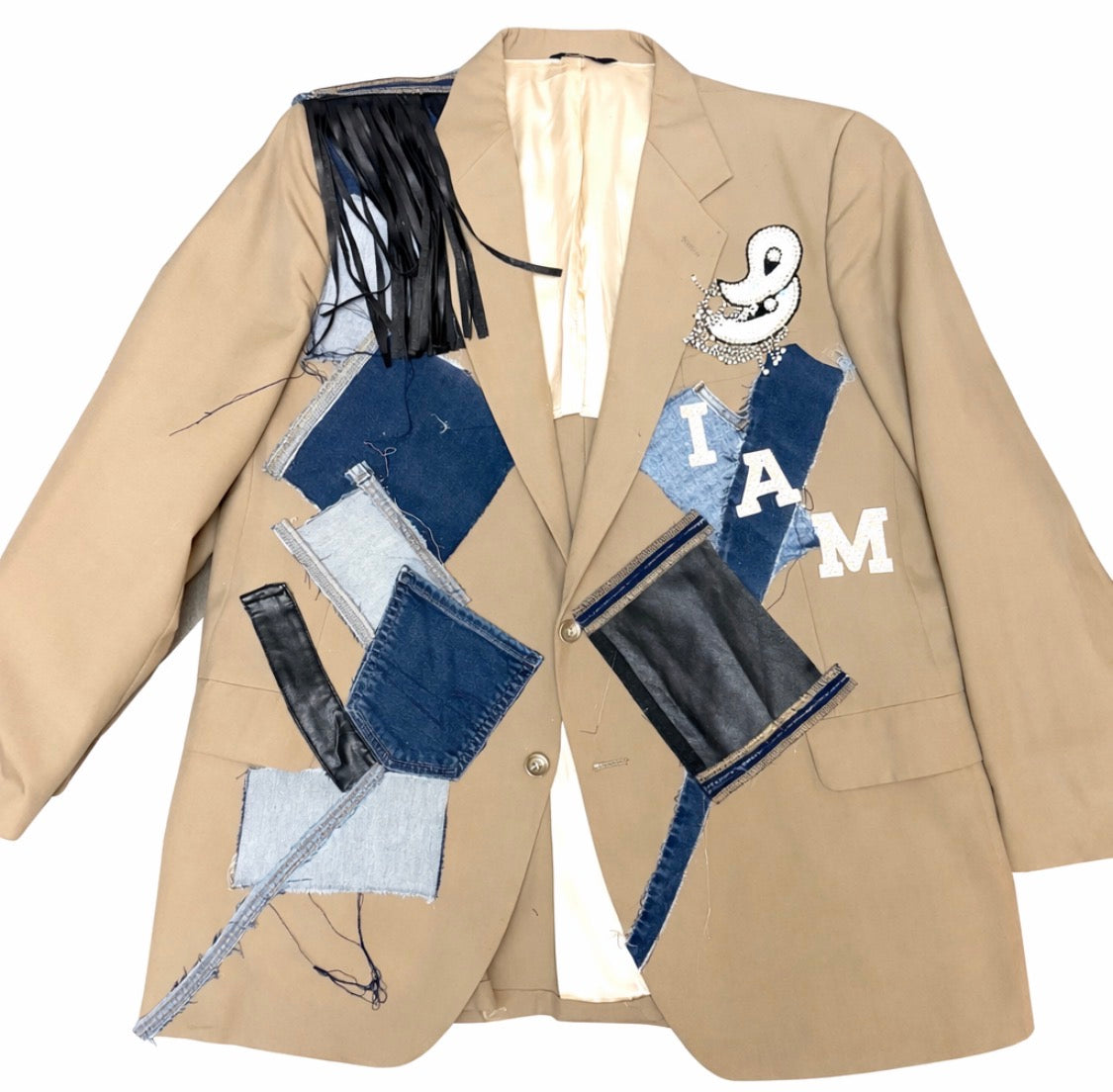The Resilient Royalty Blazer is a statement of strength, faith, and fearless identity. Crafted on a classic tan tailored blazer, this design features bold patchwork of multi-tone denim and black vegan leather, symbolizing beauty rising from broken places. Raw edges and asymmetrical placement reflect the journey — not perfection, but power in process.