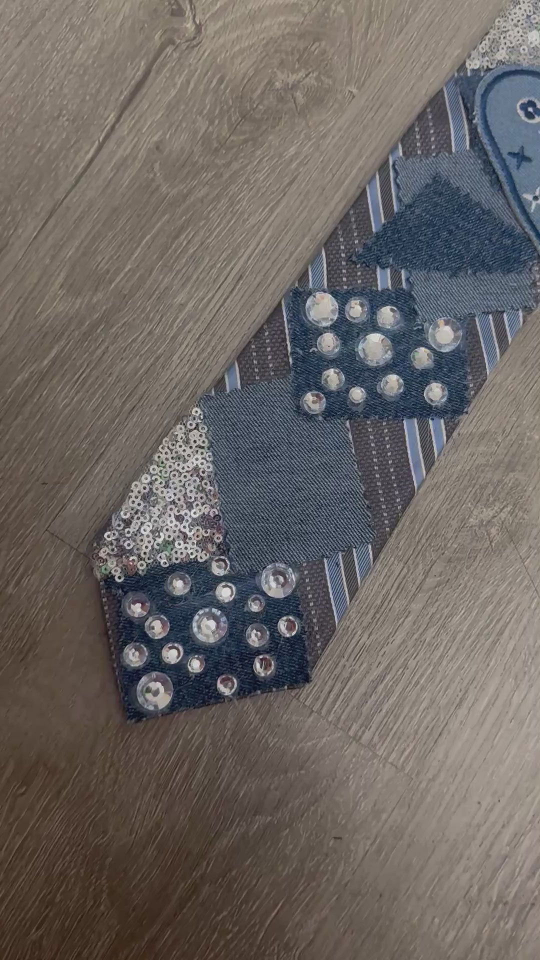 This sophisticated tie blends classic style with bold creativity, featuring a sleek gray-and-blue striped base. Layered denim patches, adorned with sparkling rhinestones and shimmering silver sequins, create a striking patchwork effect. A standout element is the denim heart appliqué with designer-inspired detailing, adding both charm and elegance. Finished with dazzling rhinestone clusters along the bottom, this tie embodies modern flair with a touch of luxury—perfect for those who want to stand out with confidence and unique style.