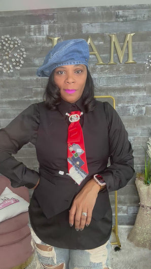 Bold. Urban. Unapologetically stylish. The Denim Royalty Patchwork Tie blends street-chic creativity with high-fashion confidence. Featuring a vibrant red satin base, this tie is accented with mixed denim patchwork, metallic embellishments, and a touch of sparkle—creating a standout piece that celebrates individuality and artistic edge. The silver Chanel-inspired brooch at the collar adds a luxe finish, making this tie perfect for photoshoots, pop-up events, or any day you want to command attention.